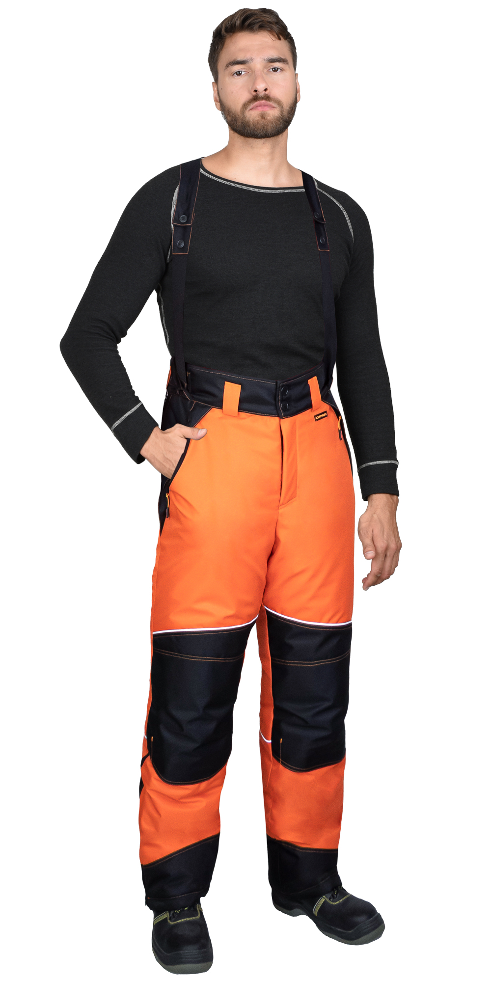 Брюки прямые, на утеплённой подкладке, с застежкой в среднем шве передних половинок на гульфик с молнией, с отрезным фигурным широким поясом с застежкой на пуговицы, со шлевками, с хлястиками по бокам на липучках, с внутренними боковыми карманами на молнию, с объемными наколенниками. Понизу боковых швов разрезы, застегиваются на молнию. В брюках предусмотрены петли для пристегивания бретелей и съемные бретели.