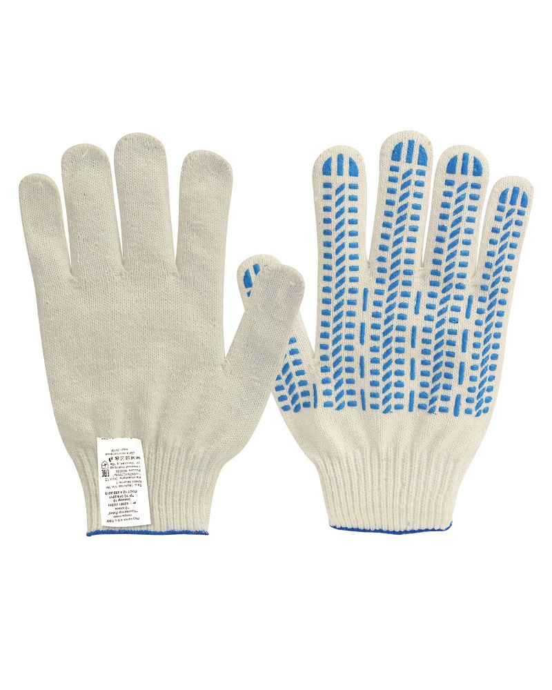 изготовлены из натурального хлопка, а точечки на контактной поверхности из специального полимерного материала. Покрытие из ПВХ позволяет крепко удерживать в руках скользящие материалы, структура покрытия не позволяет предмету вылететь или выскользнуть из руки. . Эти перчатки изготавливаются из 100% натуральной хлопковой нити, что позволяет полностью исключить аллергические реакции на искусственные материалы у рабочих, страдающих аллергией.