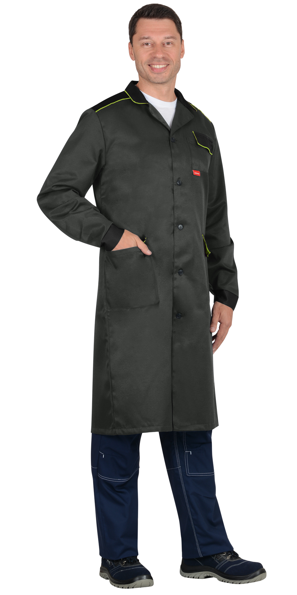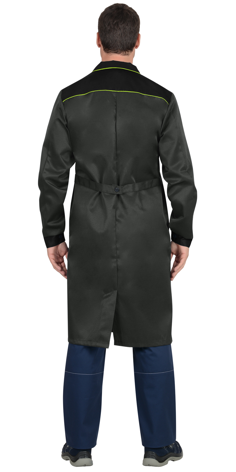 Халат мужской прямого силуэта, с центральной застёжкой на пуговицы, с отложным воротником, с втачными рукавами с манжетой на пуговице, с нагрудным и нижними карманами, со шлицей в среднем шве спинки. В халате предусмотрено крепление бейджа.